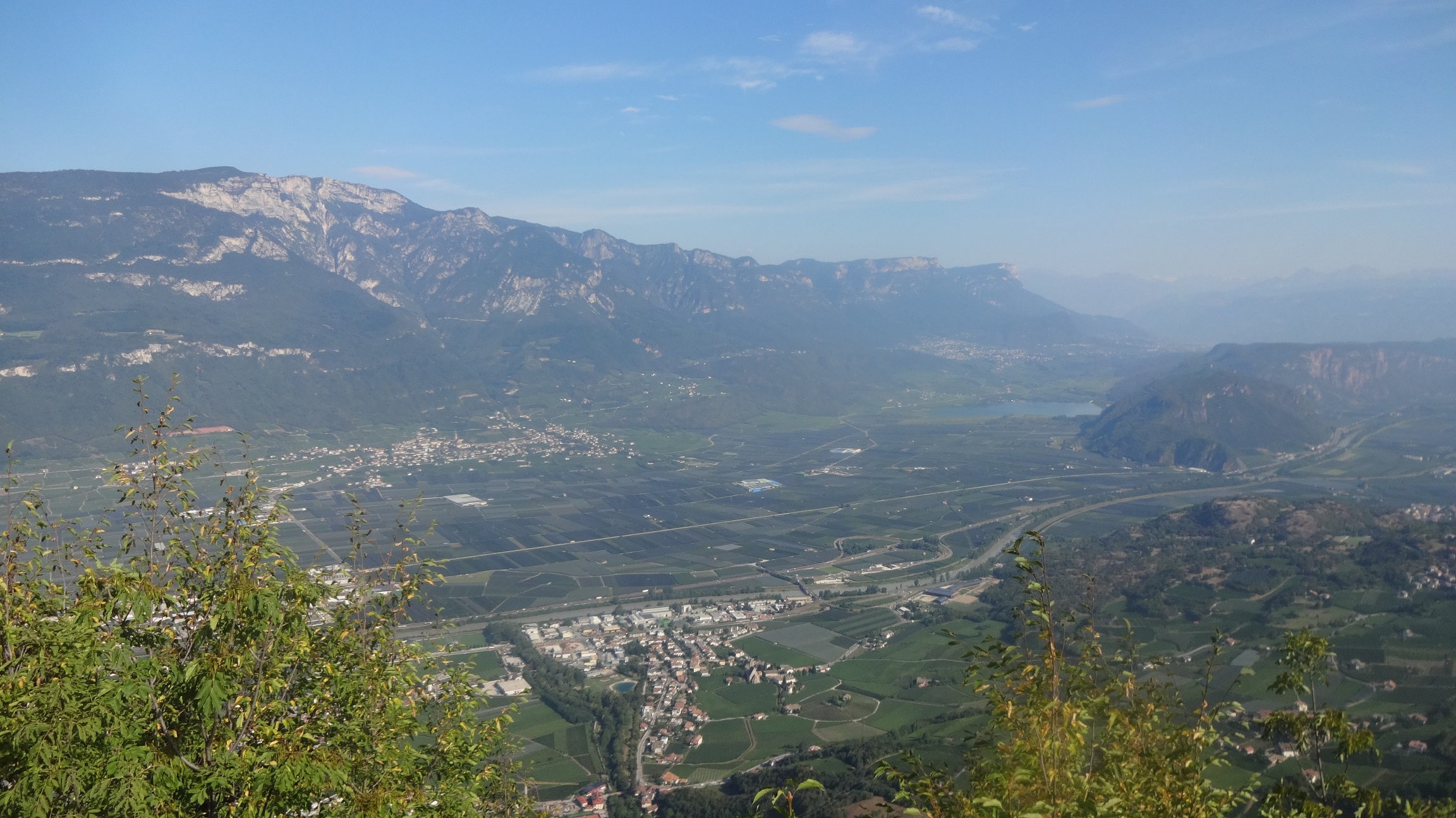 Helmut und ich fuhren kurz vor Halb neun los, erstmal runter, gute Wege. Es ging so am Hang entlang. Kleine Anstiege, soweit ok. Zwischendurch hatten wir mal kleine schwere Wege. Bei 970 m hatten wir die Kanzel gefunden, super gute Aussicht über den Kalderer See und das ganze Tal, etc.