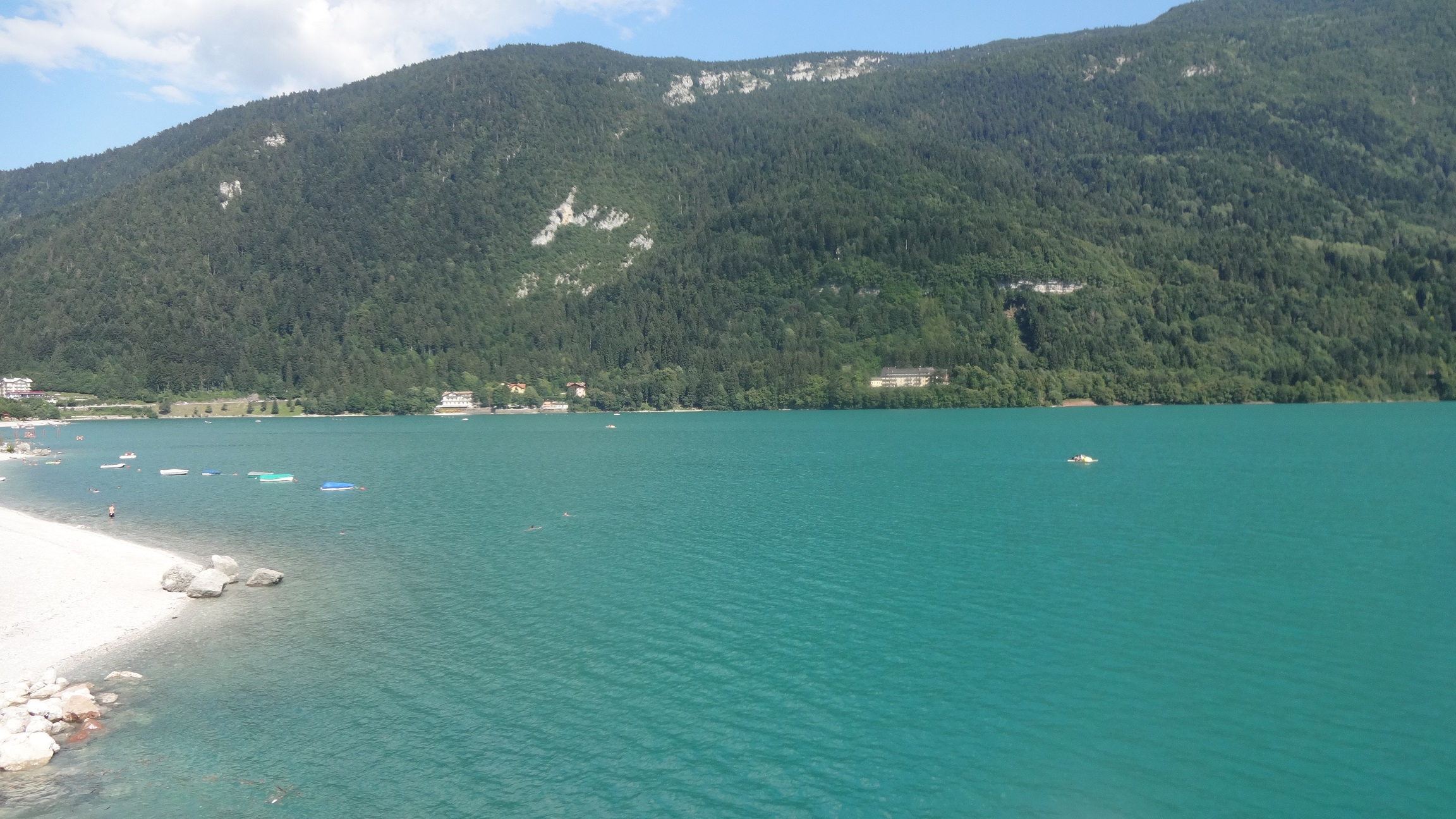 Bei Andalo waren wir oben gewesen. Helmut fand den Skiort interessant und wollte sich das näher anschauen und daher hatten wir uns getrennt. Ich fuhr die Straße weiter, war nicht mehr weit bis Molveno. Dort ging es noch westlich am See entlang, leicht wellig und einigen Touris mußte ich ausweichen.